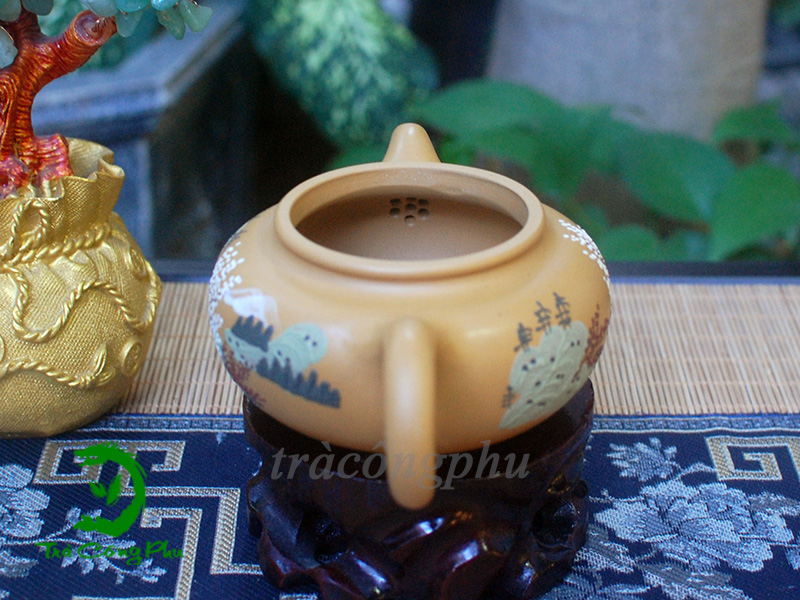 Trên thân ấm hiện lên cảnh xuân thanh tịnh, nơi mai nở giữa trời, trúc vươn bên đá, mây khẽ trôi qua non – tất cả hòa thành một khúc họa tĩnh lặng mà sinh động. Bức họa không chỉ là trang trí, mà còn là ẩn dụ cho phẩm hạnh người quân tử: kiên định như trúc, thanh cao như mai, và tự tại như mây trời. Trong từng lần rót trà, vẻ đẹp ấy như nhắc người thưởng trà giữ tâm sáng giữa dòng đời biến động, tìm an nhiên trong những điều giản dị.