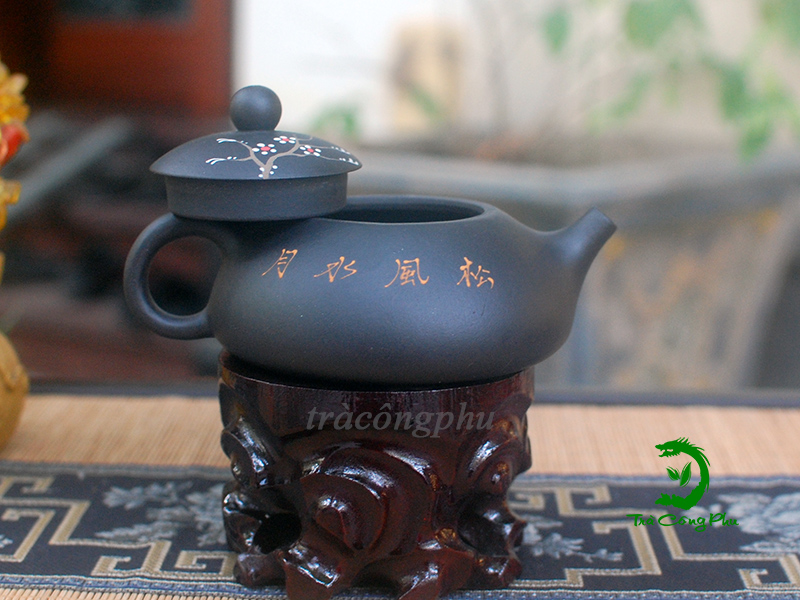 Điểm nhấn đặc biệt là dòng chữ nổi “松風水月” (Tùng Phong Thủy Nguyệt) trên thân ấm – gợi nên một không gian thiền vị, nơi gió thông, ánh trăng và dòng nước hòa quyện trong tĩnh lặng.