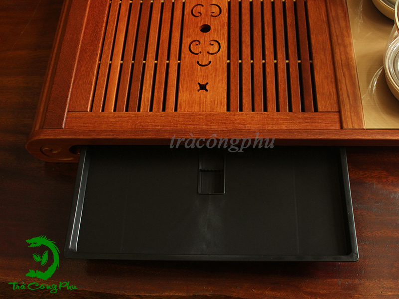 Trên mặt bàn trà các rãnh thoát nước được cắt gọn sâu, mượt mà giúp thoát nước tốt. Bàn trà điện có thiết kế phần khay nhựa dưới tách rời, có thể đổ trực tiếp trà xuống khay và dễ dàng tháo rời nắp, rất tiện lợi khi vệ sinh khay.