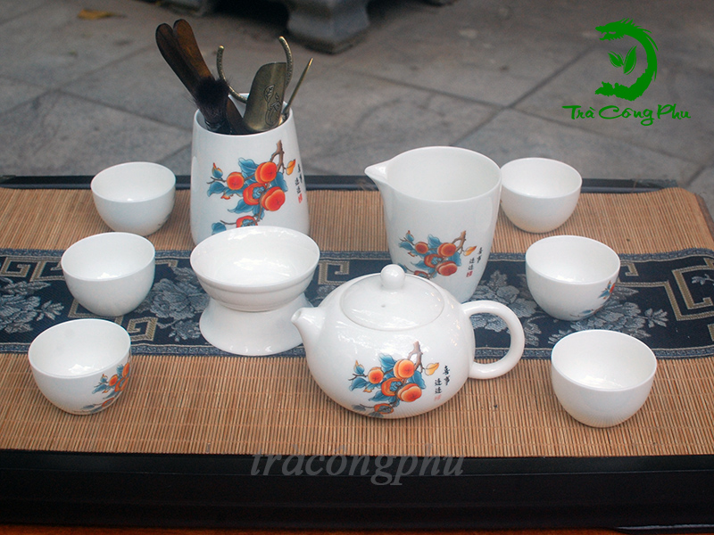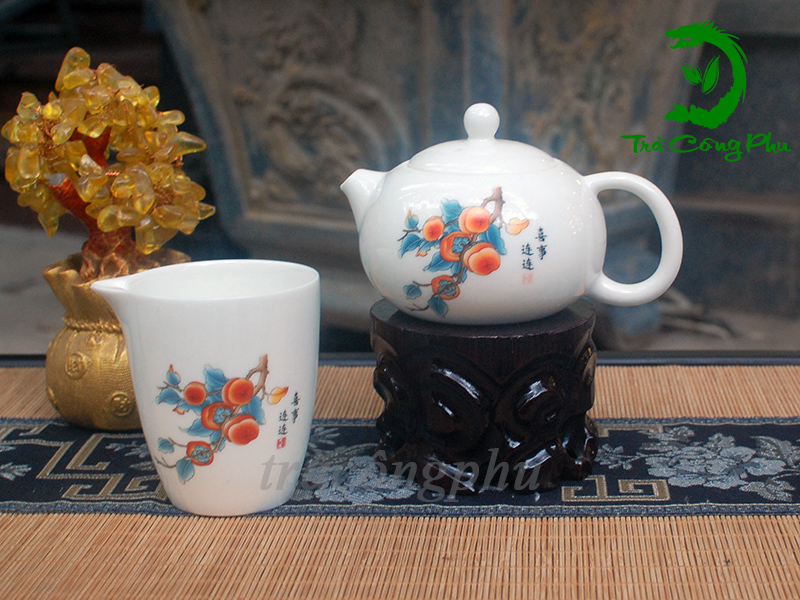 Đặc biệt hơn cả đó là bộ ấm trà họa trên mình họa tiết quả hồng được vẽ tay vô cùng tỉ mỉ. Những quả hồng chín mọng với sắc cam rực rỡ nổi bật trên nền sứ trắng, gợi lên hình ảnh của sự sung túc và tràn đầy nhựa sống. Trong văn hóa Á Đông, quả hồng là biểu tượng của “Hỷ sự liên miên” và “Vạn sự như ý”. Hình dáng tròn trịa của quả hồng tượng trưng cho sự viên mãn, không khiếm khuyết, mang đến năng lượng tích cực và lời cầu chúc bình an cho gia chủ trong mỗi buổi trà chiều.