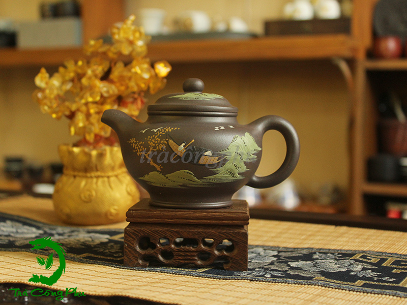 Ấm đạt chuẩn về công năng để pha trà. Quai ấm cong tròn hơi hướng lên, núm nắp ấm to tựa viên ngọc, vòi ấm không dài quá hay ngắn quá đảm bảo dòng trà chảy mịn, đẹp mắt. Trên thân ấm được nghệ nhân họa bức tranh sơn thủy hữu tình với những dãy núi nối tiếp nhau, uốn quanh, tựa như một bản nhạc liên tiếp không ngắt nhịp. Bức tranh sơn thủy có cây, có đồi núi, có trời cao, mây trắng... tất cả hòa quyện nhịp nhàng. Mặt sau của ấm được đề thêm hai từ " 怡人 DI NHÂN". Di nhân khi dùng cho phong cảnh sẽ là miêu tả sự hòa hợp, yên tĩnh, nhưng khi dùng để chỉ người lại mang hàm ý dễ thương, xinh đẹp.