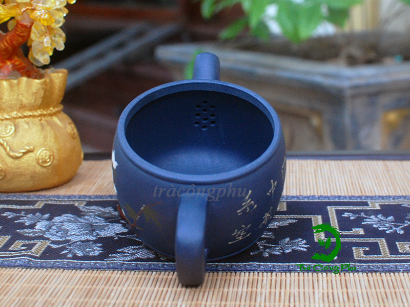 Dòng thư pháp "Trà Minh Tâm Tứ Châu" (茶茗心四周) – "Bôi Trung Trà Bất Không" (杯中茶不空) được khắc một cách tinh tế, mang đậm triết lý trà đạo. Câu chữ này có nghĩa là "Chén trà luôn đầy, tâm luôn tĩnh", nhấn mạnh sự quan trọng của việc giữ tâm tĩnh lặng khi thưởng trà. Nó phản ánh một quan niệm sâu sắc trong văn hóa trà, rằng trà không chỉ là thức uống mà còn là người bạn tri kỷ, giúp người thưởng trà tìm về sự an yên. Đây như một cách thể hiện sự hòa hợp giữa tâm và trà, giữa con người và bốn phương, với hàm ý rằng khi lòng còn tĩnh lặng và trà còn đậm đà, thì tâm hồn chẳng bao giờ trống rỗng.