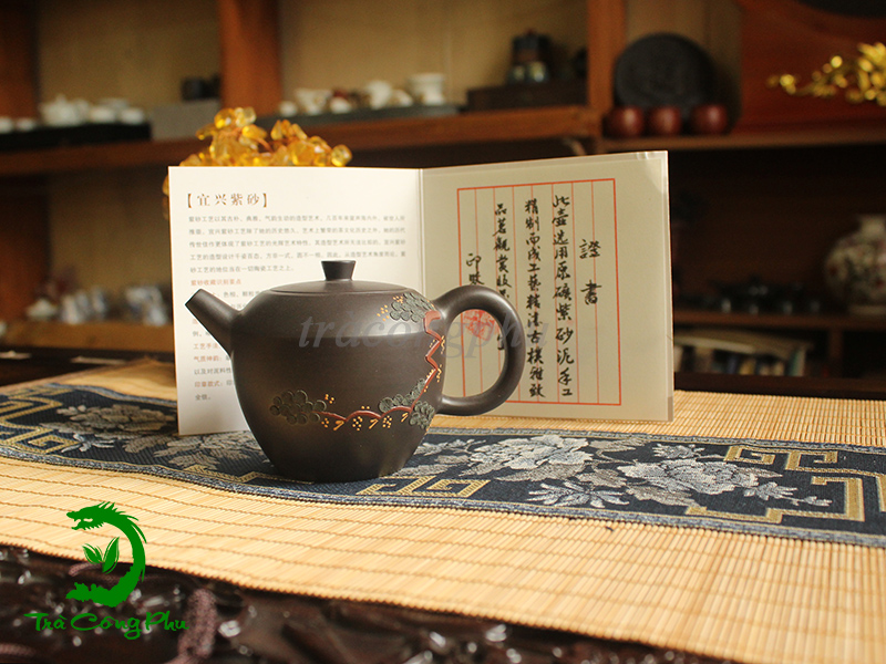 Các lỗ khổng khí được chế tác chuẩn mực cho dòng nước mượt mà, mềm mại, không bị nhỏ giọt, ngắt dòng rất tốt. Trên thân ấm nổi bật hình ảnh cành tùng la hán đang nở hoa cùng dòng chữ " "上 善 若 水 -Thượng Thiên Nhược Thủy ". Tùng La Hán hay còn được gọi với tên gọi khác vạn niên tùng là loài cây mang lại sự bình an, may mắn, tài lộc, sự phồn vinh, thịnh vượng; là loài cây tượng trưng cho sự hùng dũng, oai nghiêm, sự mạnh mẽ kiên định của bậc nam nhi anh hùng.