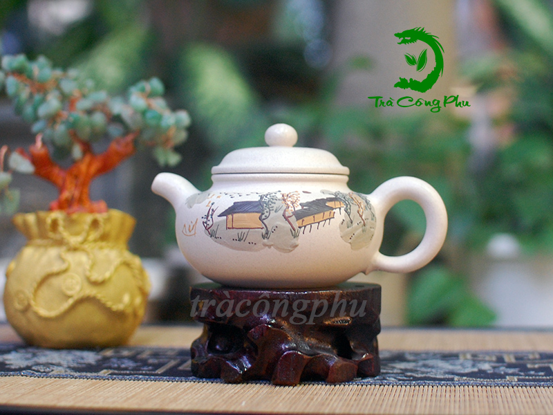 Ấm được nghệ nhân Tôn Thành Lan (孫成蘭製) chế tác thủ công tại Nghi Hưng – Trung Quốc, quê hương của những tuyệt tác trà cụ nổi tiếng. Trên thân ấm khắc họa cảnh đình viện cổ cùng dây leo uốn lượn, gợi cảm giác ẩn dật thanh nhàn giữa cõi trần tĩnh lặng. Hình ảnh ấy không chỉ là nét vẽ trang trí, mà còn gửi gắm tinh thần hòa trà – dưỡng tâm – quy nguyên tự nhiên. Mỗi lần rót nước là một lần vọng về đạo lý an nhiên, giản dị mà thâm sâu của người thưởng trà.