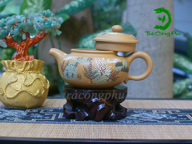 Trên thân ấm hiện lên cảnh xuân thanh tịnh, nơi mai nở giữa trời, trúc vươn bên đá, mây khẽ trôi qua non – tất cả hòa thành một khúc họa tĩnh lặng mà sinh động. Bức họa không chỉ là trang trí, mà còn là ẩn dụ cho phẩm hạnh người quân tử: kiên định như trúc, thanh cao như mai, và tự tại như mây trời. Trong từng lần rót trà, vẻ đẹp ấy như nhắc người thưởng trà giữ tâm sáng giữa dòng đời biến động, tìm an nhiên trong những điều giản dị.