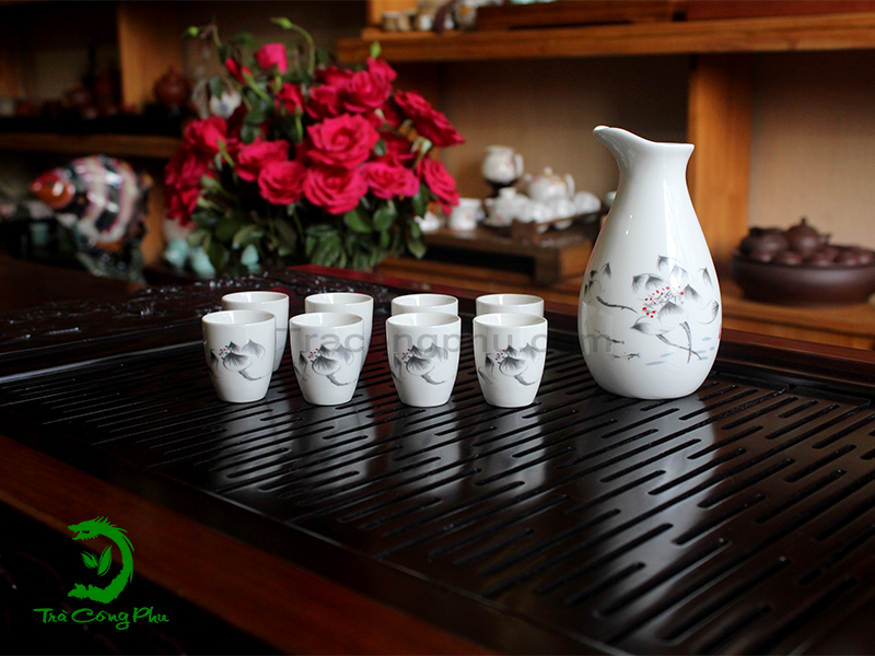 Bộ Bình Châm Tửu được trang trí bởi hình ảnh bông hoa sen - họa tiết đơn giản mà không kém phần tinh tế, được khắc họa rõ nét trên nền sứ men trắng bóng.