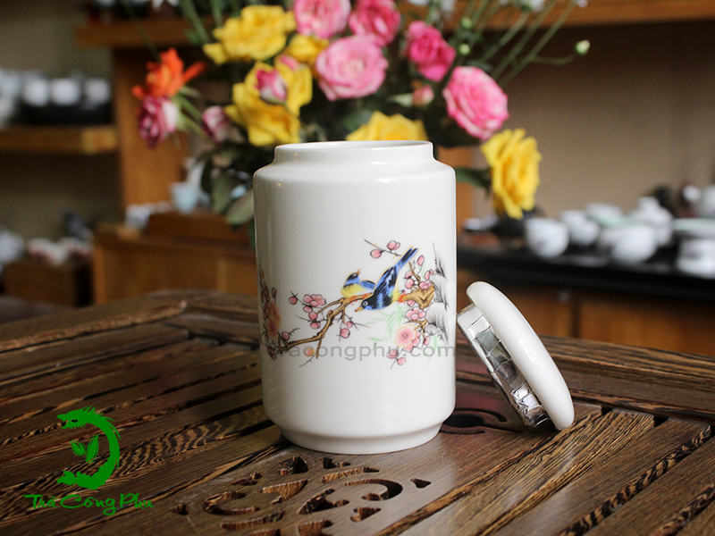 Chất liệu men sứ trắng làm nổi bật lên họa tiết hoa đào màu hồng tinh tế, thể hiện sự tươi mới khi xuân sang đào nở, mang đến may mắn cho mọi nhà. Bình đựng trà có dáng bầu tròn đều, nắp và miệng khít chặt tránh cho trà tiếp xúc với độ ẩm và không khí làm ảnh hưởng đến chất lượng của trà.