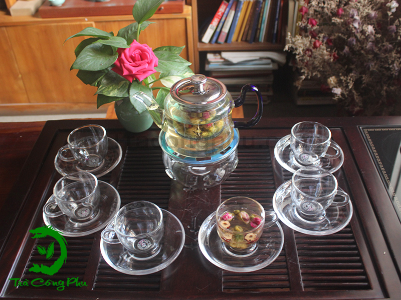 Bộ ấm chén gồm có 01 ấm thủy tinh, 06 chén thủy tinh hai lớp, 06 đĩa lót chén và 01 đế đun chịu nhiệt giúp cho nước trà luôn được ấm nóng. Chỉ cần cho trà vào trong ấm, rót nước sôi vào pha trà. Khi trà đủ độ chín các chén quân và thưởng thức.