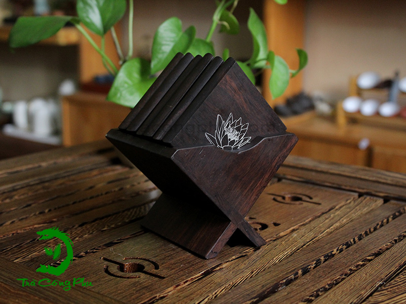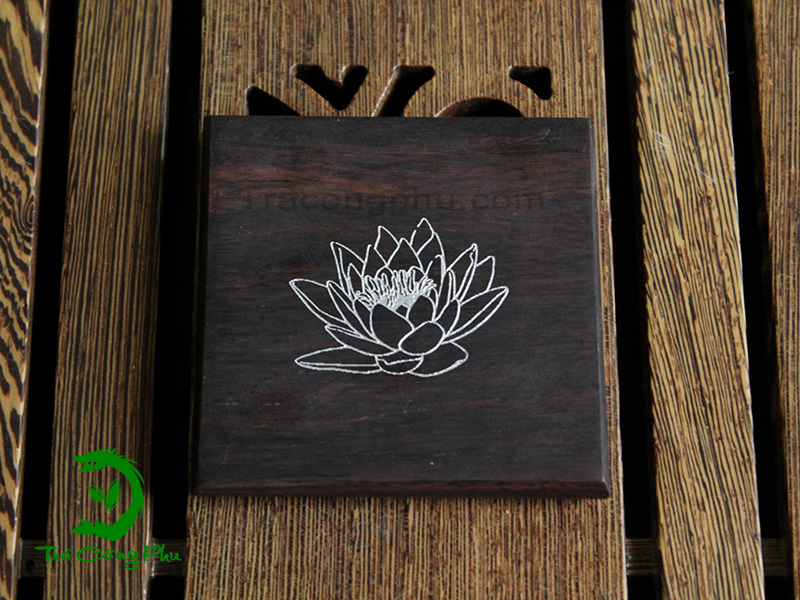 Đế chén được làm bằng gỗ tự nhiên, dày dặn, chắc chắn, các đường vân gỗ nổi bật, tự nhiên, ở giữa là hình tròn lõm và sâu hơn để đặt chén được chắc chắn, không bị nghiêng, đổ.
