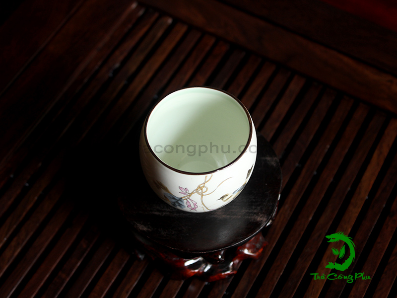 Chén Sứ Cao Cấp - C179 có hình bầu, cao, chắc chắn, lớp men sáng rõ. trang trí của mặt bên ngoài là những nét vẽ nhẹ nhàng, bay bổng của chú chim đậu trên cành cây - họa tiết đơn giản mà không kém phần tinh tế. Chén vừa dùng để uống, vừa là vật trang trí, tô điểm cho bàn trà của quý trà nhân.