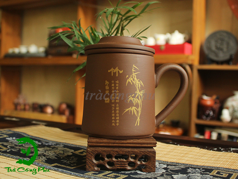 Cốc pha trà tử sa - CU25 có thiết kế màu nâu đậm được trang trí bằng hình ảnh cành trúc - loài cây tượng trưng cho sự ngay thẳng, chính trực của bậc chính nhân quân tử. Nắp trà có núm cầm chắc chắn, vừa khít với thân cốc và giữ nhiệt rất tốt. Cốc có quay cầm tiện lợi và đẹp mắt. Phù hợp với những người thích sự đơn giản, tiện lợi.