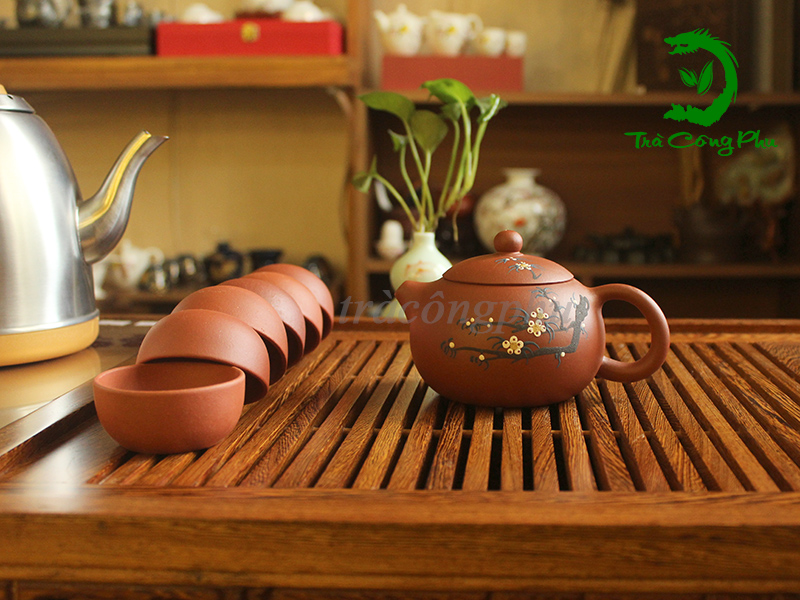 Bộ ấm chén chu sa là sự kết hợp giữa ấm tử sa tây thi mai hoa ATS1152 , chén C211. Bộ ấm chén bao gồm 1 ấm và 06 chén quân. Ấm khi rót trà có độ ngắt nước rất chuẩn, không bị rớt rọt miệng vòi. Trà khi pha xong để lâu trong ấm sau khi đã sử dụng nhưng không bị thiu hoặc mốc. Các chén đều nhau, không bị lệch lạc.