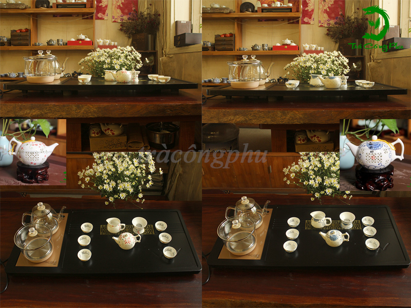 + 1 khay trà + 1 bếp điện + 1 ấm đun nước + 1 nồi khử trùng + hệ thống dẫn nước.